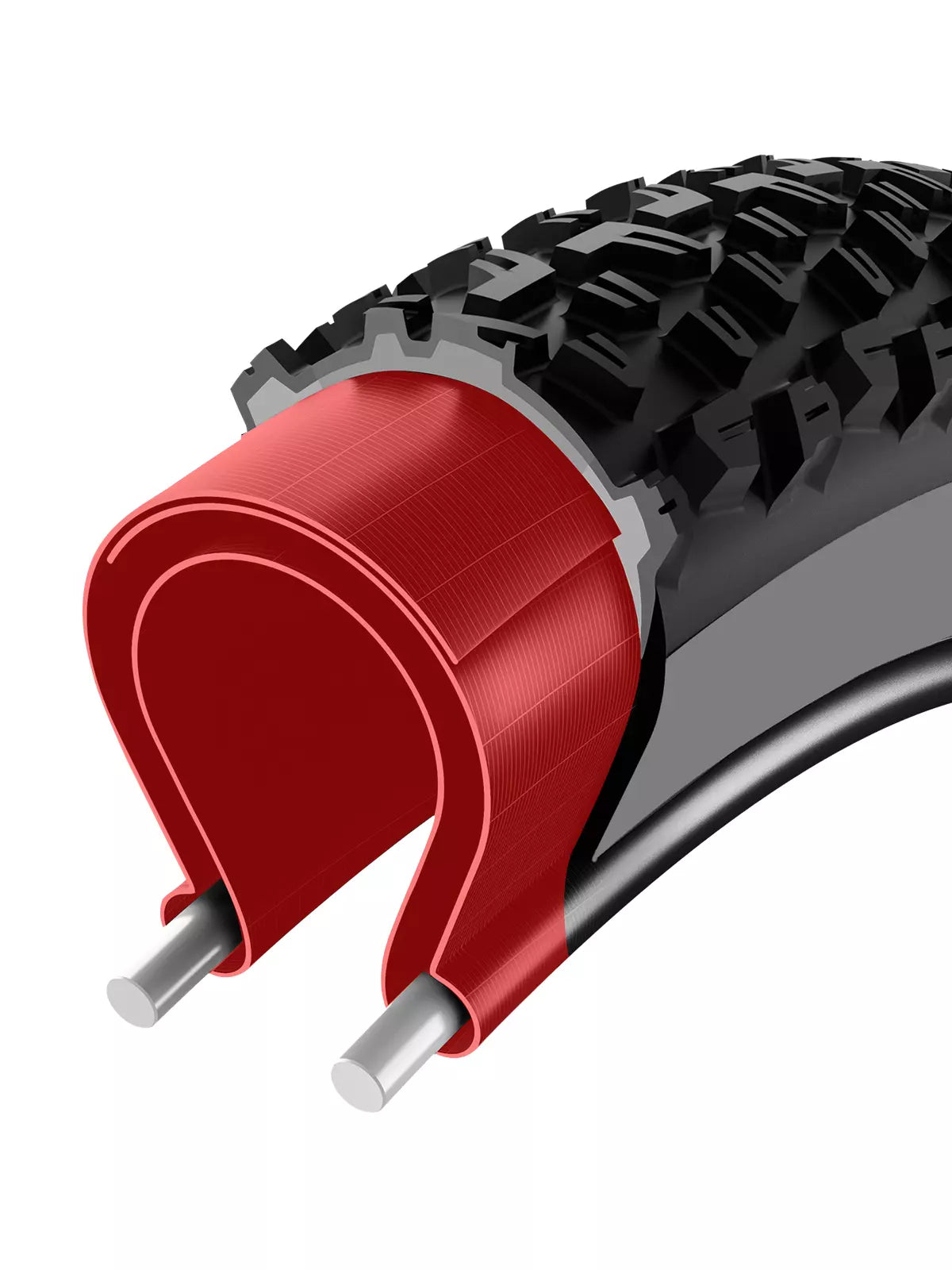 Rubber, infused with Graphene in a graduated schedule of four compounds across the rolling strip and shoulders. Two stabilizing base compounds boost puncture resistance and create a foundation for climbing, braking, and cornering loads. The trail-side compounds reduce rolling resistance, boost traction, and get tacky on switchbacks and off-camber sections, wet or dry.